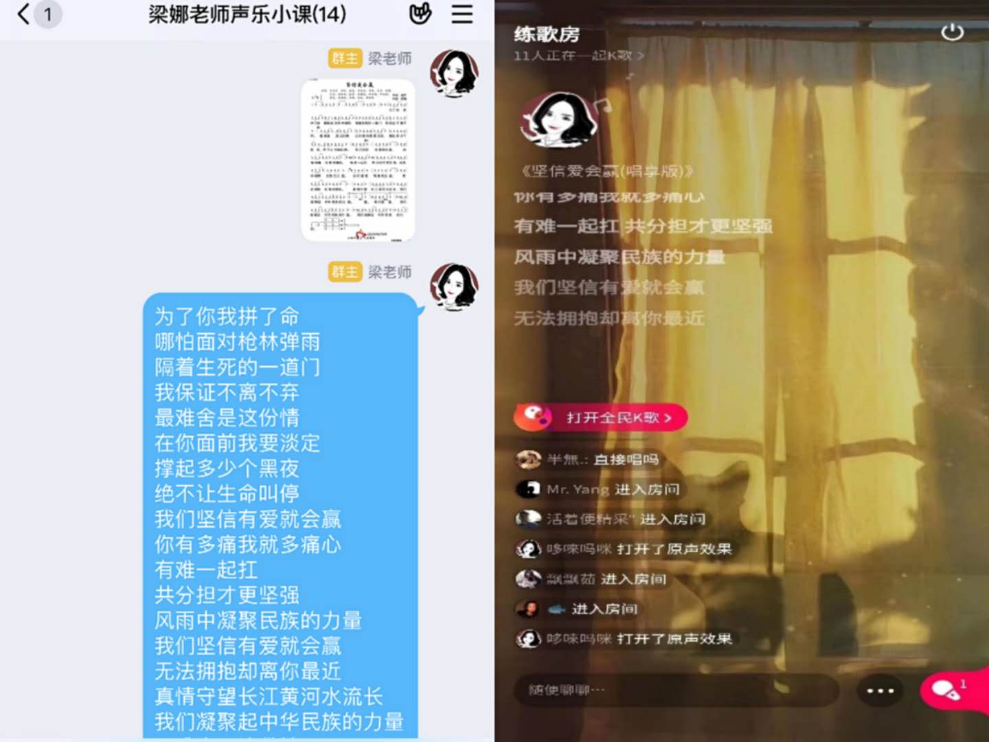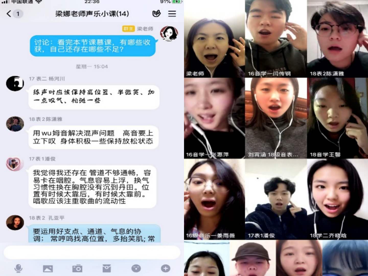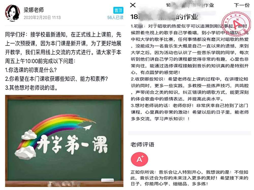 对于专业特点突出的声乐集体课和声乐技能课,如何还原课堂面对面、口传心授的方式,梁娜老师也花了一番心思。课前,她在家提前录制了示范视频,精心选择了国家慕课平台和名师教学视频,通过QQ建立课程群,上传丰富的教学资料。上课时,师生根据不同的教学环节和内容,熟练切换不同的方式,讲授内容和讨论问题在直播间,示范教学和练习采用视频面对面,作业将文字、语音、视频结合起来。为了解决多人视频卡顿的问题,他们还别出心裁地将课堂搬到了“练歌房”,实现了展示、观摩、交流、指导很好的结合。