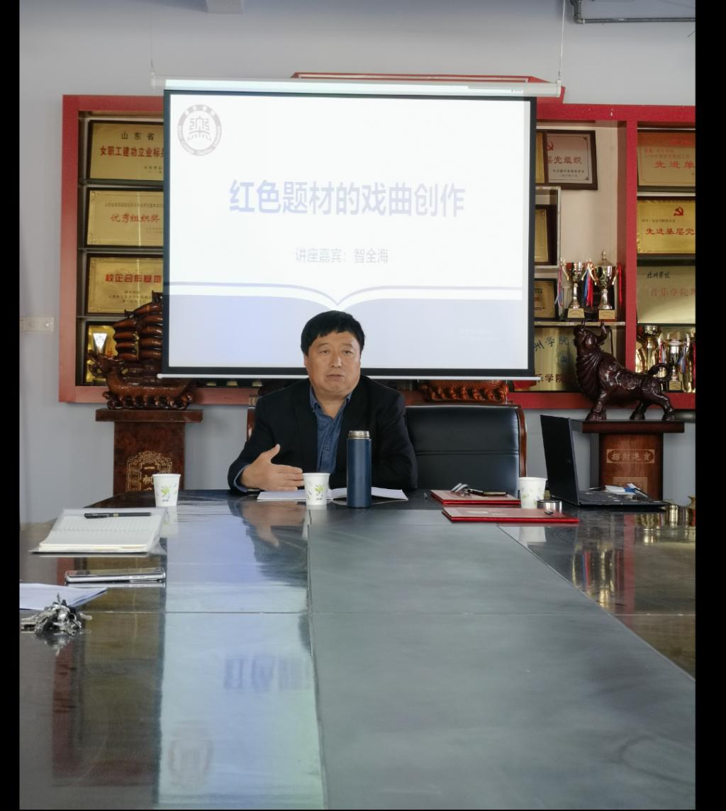 接下来的讲座,智全海教授以红色动人故事为切入点,生动的描述了中国红色戏剧的发展历史、特色和审美价值,并播放了部分戏剧视频,让大家更直观的感受到红色戏剧之美。智教授表示,红色戏剧的创作主题在不同时期具有不同的选择需求,呈现出与时代主流契合,反映一定时代背景下人民群众的物质生活和精神状态。最后,智教授分享了有关德州苏禄王歌剧的创作框架,与老师们展开积极深入地探索与交流。