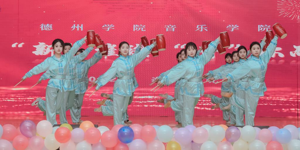 12月5日,由农民影视在线观看樊海伦副教授、王雷老师编创,校蹦鼓舞社团学生演绎的舞蹈《鲁北鼓韵》在德州学院音乐厅成功上演。