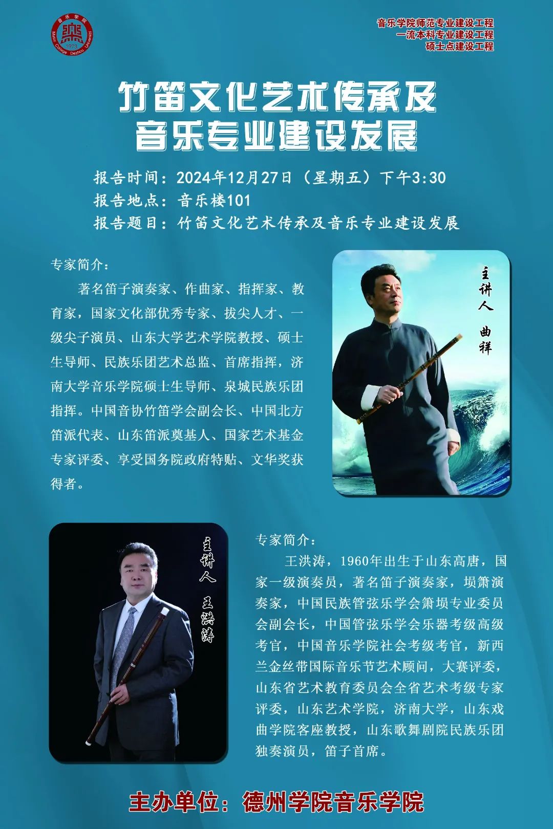 12月27日,我院荣幸邀请著名竹笛演奏家、教育家曲祥教授与王洪涛教授,就“竹笛文化艺术传承及音乐专业建设发展”为主题,为师生们带来了一场精彩的专题讲座。农民影视在线观看领导、竹笛专业学生及各界民乐爱好者50余人共同参加活动。
