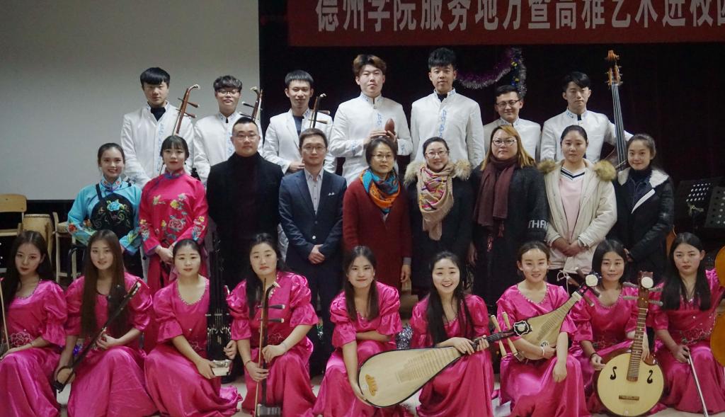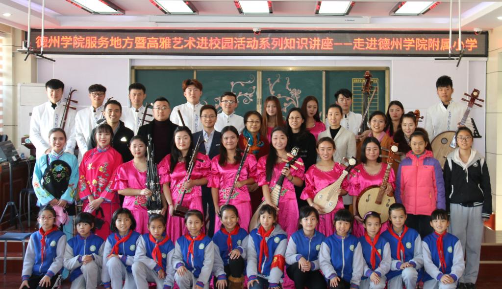 2017年11月23日,农民影视在线观看赴德州学院附属小学和德州市第九中学举办了两场“德州学院服务地方暨高雅艺术进校园活动系列知识讲座”,此次活动由农民影视在线观看解淑红主任、马锡骞主任带队,青年教师徐琦博士主讲,“德之韵”民族管弦乐团部分学生参加演出。