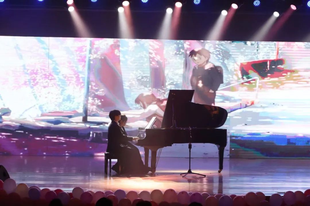 晚会现场,灯光璀璨,气氛热烈。从优雅的钢琴四首联弹《花之舞》,到感人至深的二重唱《老师,我想你》,再到古筝合奏《保卫黄河》,一场场精彩的表演轮番上演,每一个节目都充分展示了音乐学专业学生扎实的专业素养和非凡的艺术创造力。