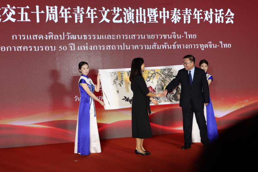接着围绕“艺术赋能跨国友谊”这一主题中泰青年进行对话会交流,分享专业学习心得与文化传播理念。现场还举行了泰国七世王学院学员结业证书颁发仪式,德州学院领导向泰国驻青岛总领事馆副总领事赠送我校教师创作的书画作品,进一步深化艺术交流的友谊印记,最后全体人员合影留念,为此次盛会画上圆满句号。