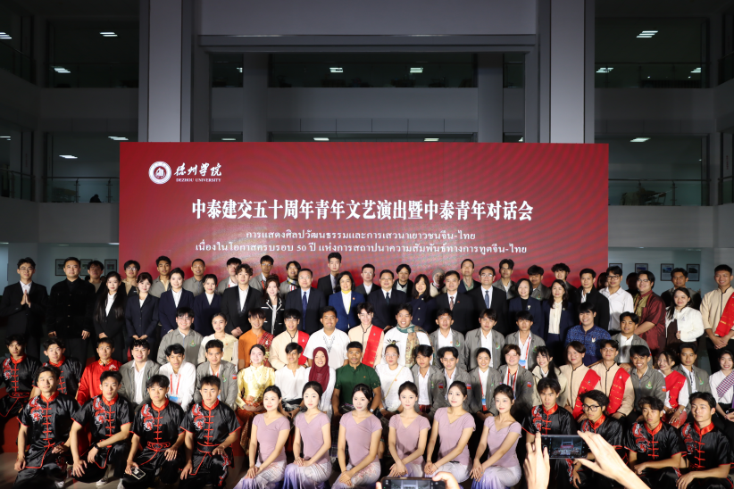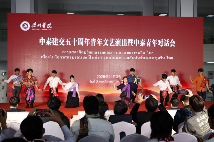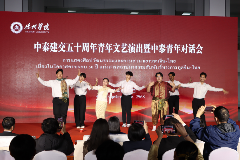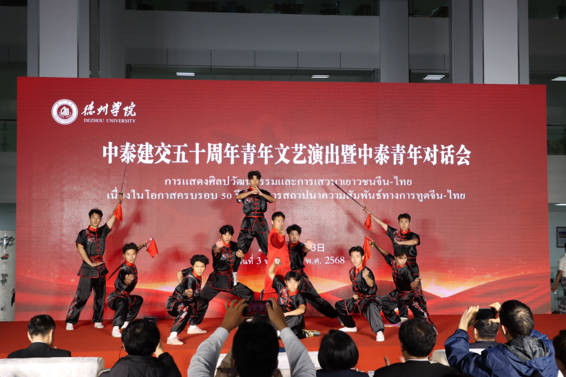 此外,德州学院师生还与泰国艺术团队联袂呈现多场精彩表演:《来自莫尔-卡恩之地的长鼓节奏舞》,精准还原泰国东北部伊桑地区的欢乐文化;武术表演《拳倾四海,谊结千秋》,融合太极拳的沉静与刀术、拳法的刚劲,展现东方哲学魅力;《兄弟情谊舞会》,以中泰合璧的扇子舞诠释“手足情深”;诗琳通公主创作的中文诗《采桃花》,由德州学院朗诵专业学子与泰国青年共同呈现,以艺术为媒传递青春共鸣。