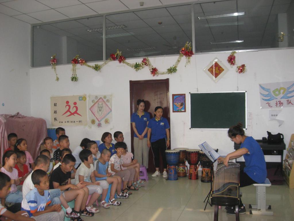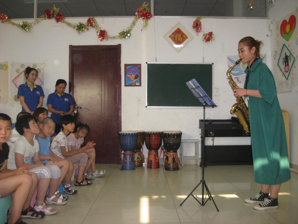 志愿者们的到来,让孩子们非常的高兴,伴随着孩子们热烈的掌声和欢呼声,开始了本次演出的第一个节目:古筝独奏《乡韵》,美妙的旋律在手指间流淌出来,婉婉乡音,悠悠乡情, 道不尽对故土的眷恋, 诉不尽对故土的深情。第二个节目是萨克斯独奏《童话镇》,金属明亮而婉转的声音给孩子们讲述着美丽的童话故事。第三个节目是我院蹦鼓舞社团带来的蹦鼓舞。蹦鼓舞又名跳鼓子,流行于陵县,起源于元朝,现为省级的非物质文化遗产。蹦鼓舞以蹦跳为主,舞姿朴实飘逸,动作幅度大而节奏性强,在大鼓、小鼓、锣、钹、镲等打击乐器的伴奏下,蹦跳扭打,变换着队形,摆出各种阵法,行如游龙浮云,跳似丹凤如林;气势恢弘,刚柔相济,时而象黄河咆哮,时而如流水潺潺,是力与美的完美结合。鼓者左手持鼓,右手握槌,边击鼓边舞,鼓的基本动作为:十字步打鼓、扭步打鼓、踢腿打鼓、射雁跳打鼓、飞脚打鼓、转身打鼓、踹雁打鼓等。蹦鼓舞是优秀的民间传统文化,但是现在在陵城区面临者失传的危机,我院樊海伦副教授、孙晓丹和韩晗老师带领着舞蹈生们学习了这一民间舞蹈,这将有利于蹦鼓舞的传承,有利于民间优秀传统文化的发展。志愿者们精彩的演出引起了特教培训学校同学们的热烈掌声。接着,跳蹦鼓舞的大哥哥、大姐姐们现场教孩子们打蹦鼓,孩子们学得都非常认真,也都很愿意学,由此也使孩子们充分感受到了我国优秀传统文化的魅力。之后,特教培训学校孩子们为了感谢大哥哥、大姐姐的到来,也献上了精彩的节目。首先是非洲鼓合奏《红山果》,之后,是尚安冉小朋友的独唱《相信梦想》,他们的演出也是非常的精彩,打动和感染着在场的每一个观众。