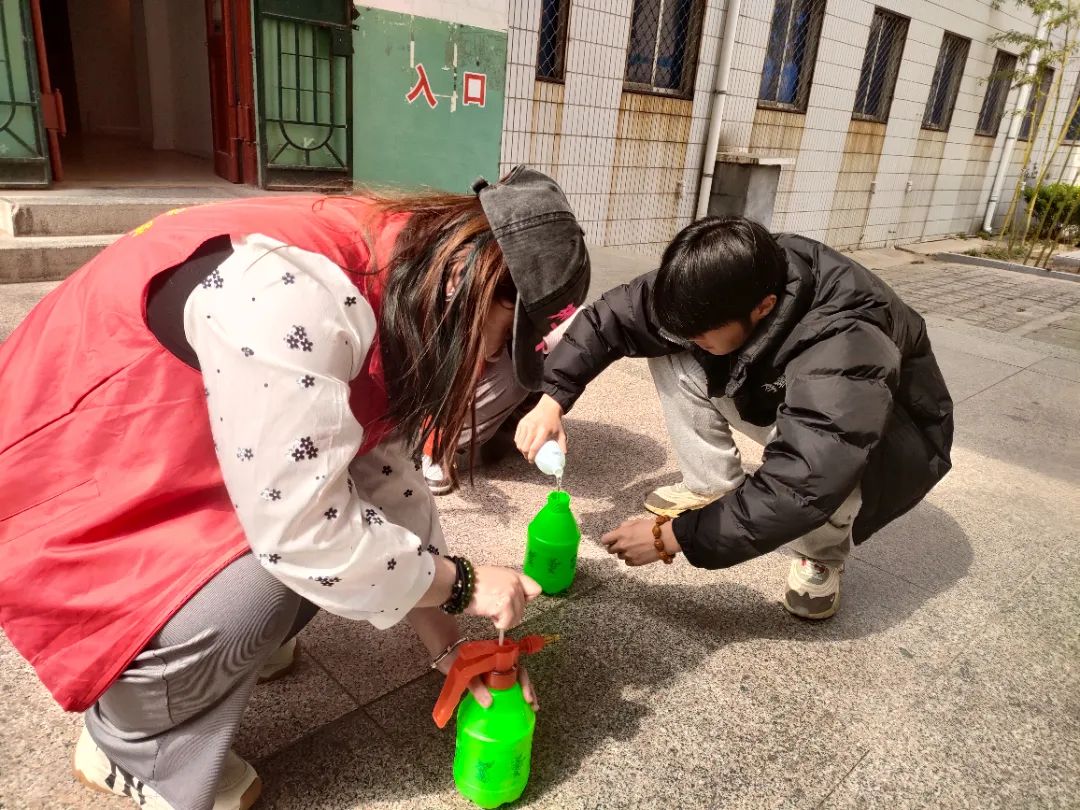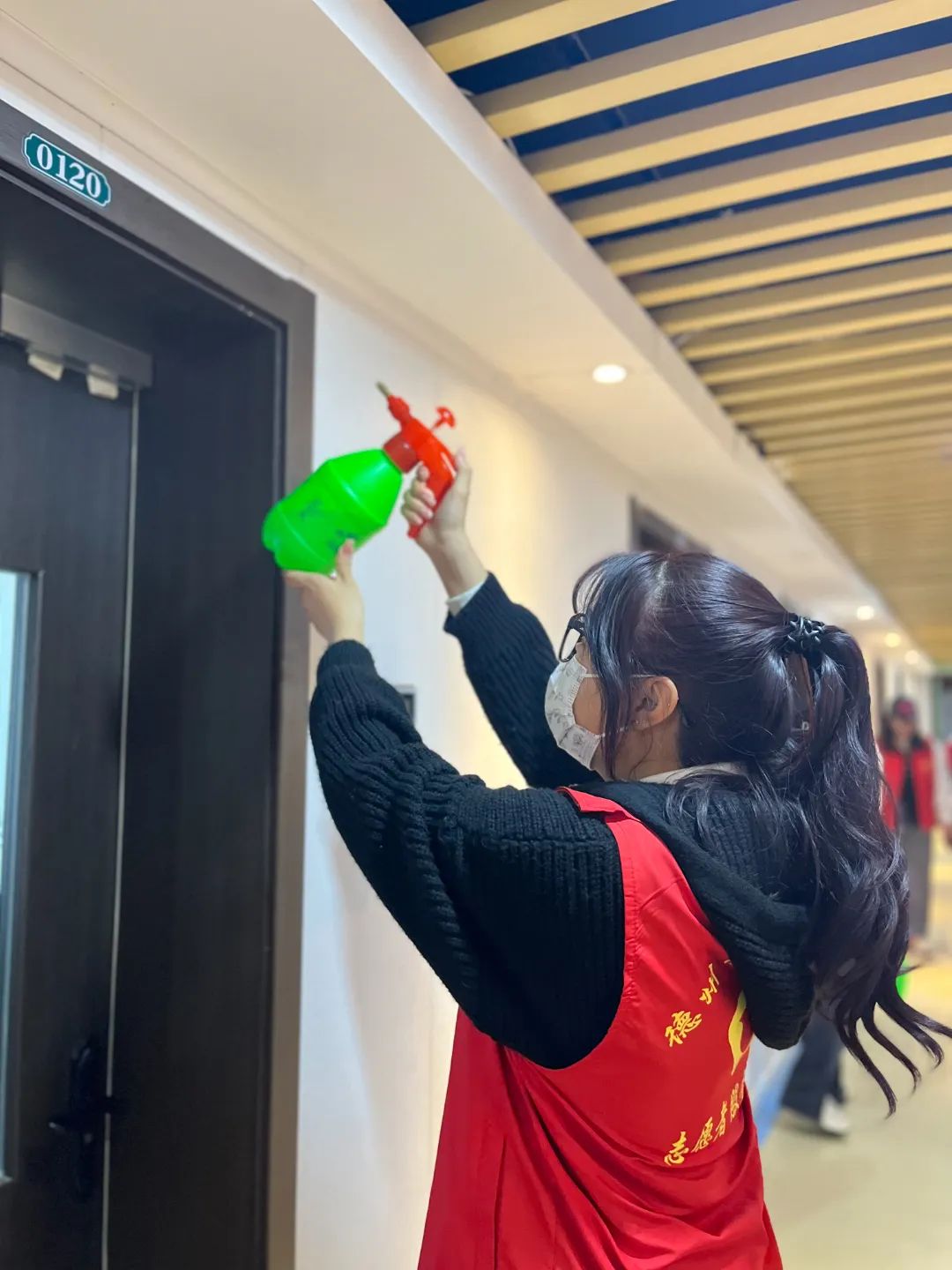 活动中,志愿者在琴房过道、琴房门口、琴房内全方位喷洒消毒水,把消杀工作落实到走廊的每一处。整洁的琴房,干净的楼道都是志愿者努力的成果。