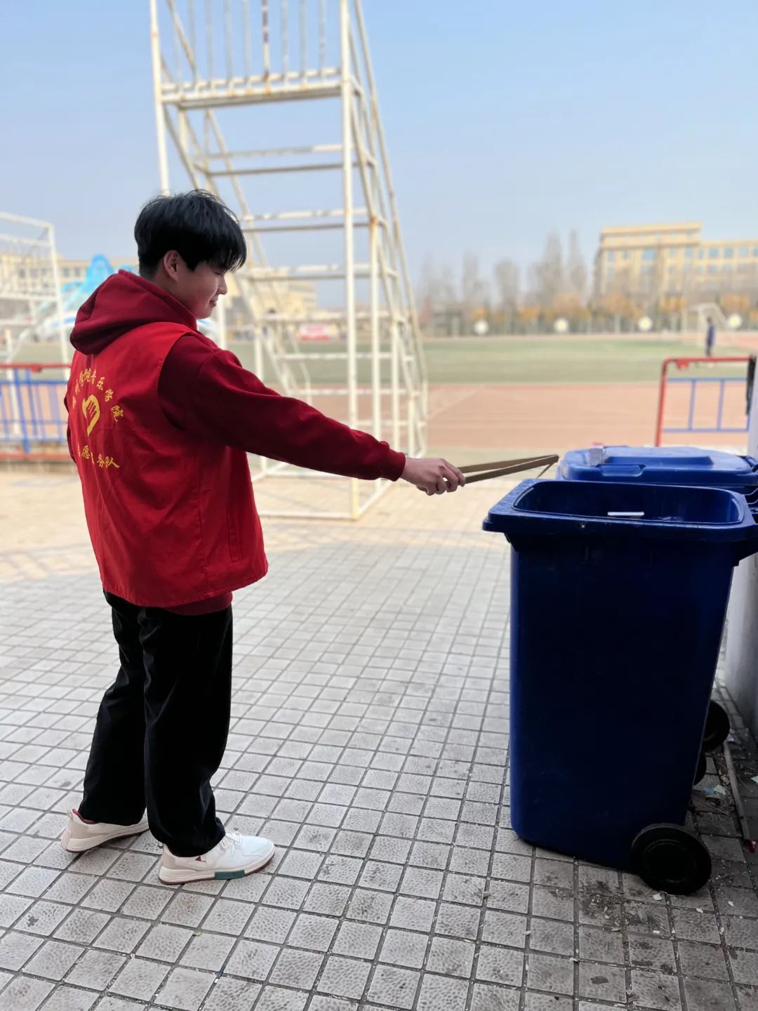 在此次校园清扫活动中,志愿者们身着红色马甲,出现在校园的各个角落。志愿者们认真清扫校园内的枯枝落叶、杂草杂物,以及花坛里的烟头纸屑。志愿者们不怕脏,不怕累,为校园整洁明亮的环境辛勤劳动,挥洒着自己的汗水。活动结束后,志愿者们将垃圾装运丢弃至垃圾桶,并将清扫工具放至原处。