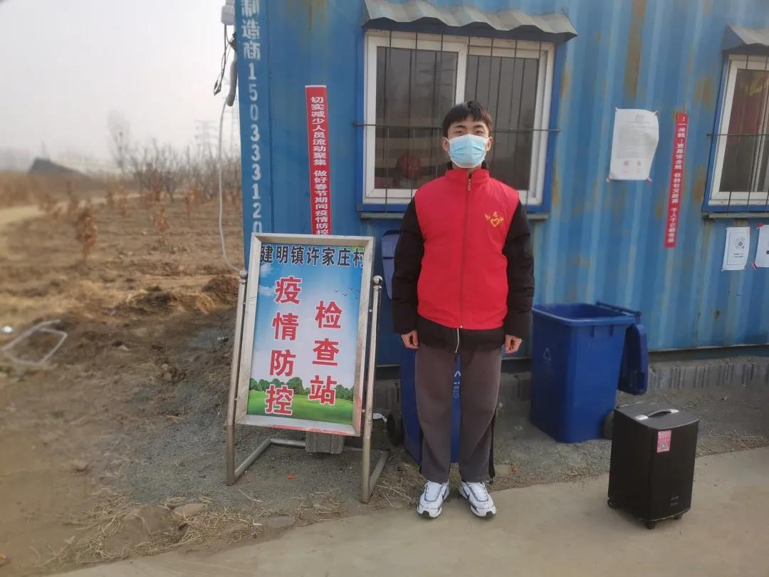 他在河北省唐山市遵化市建明镇许家庄村做志愿者,抗击疫情服务中他的工作是疫情防控点人员出入登记。他说:“作为一名青年大学生我报名参加了家乡的防疫志愿者工作,主要负责家乡人员信息登记,体温检测,卡点执勤工作。通过参加防疫志愿者,我深刻感受到疫情就是命令,新型冠状病毒感染的肺炎疫情时刻牵动着大家的心,感受到国家对此次疫情的重视,针对此次疫情高效率的下发工作安排,以及政策调整大大提高了我们的重视程度,减少了我们的心理焦虑,更是降低了病毒传染的风险。”