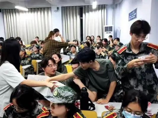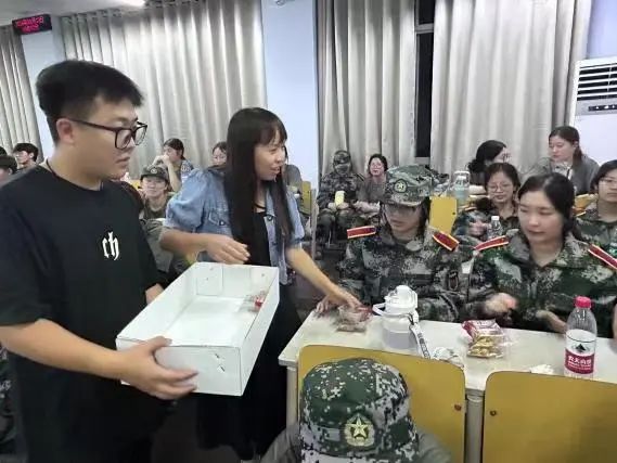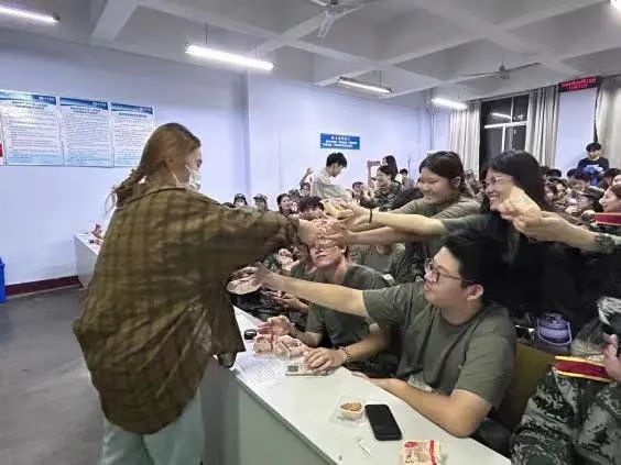 学院教师代表陈璨、唐恒新走进新生队伍,为同学们送中秋月饼,与同学们聊中秋文化,让同学在艰苦的军训训练之余感受到学院的温暖。