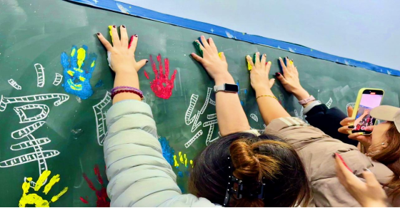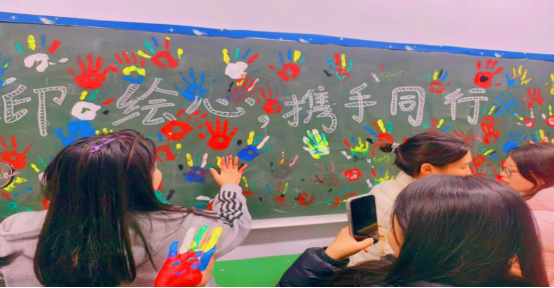 活动现场秒变大型“彩手”创作工坊,同学们在艺术中释放压力,在欢笑中联结彼此,共同绘制了一幅独一无二的温情画卷。当五彩的水彩颜料和各式画笔发到手中,同学们不再是安静的画者,而是化身为充满奇思妙想的“手部艺术家”。大家手忙脚乱地调配着心仪的颜色,举着自己的“创意掌印”互相展示,笑声此起彼伏。活动尾声,全体参与者聚集在“掌印画布”前,以一张定格笑容与色彩的大合影圆满收尾,成为此次心理活动最珍贵的纪念。