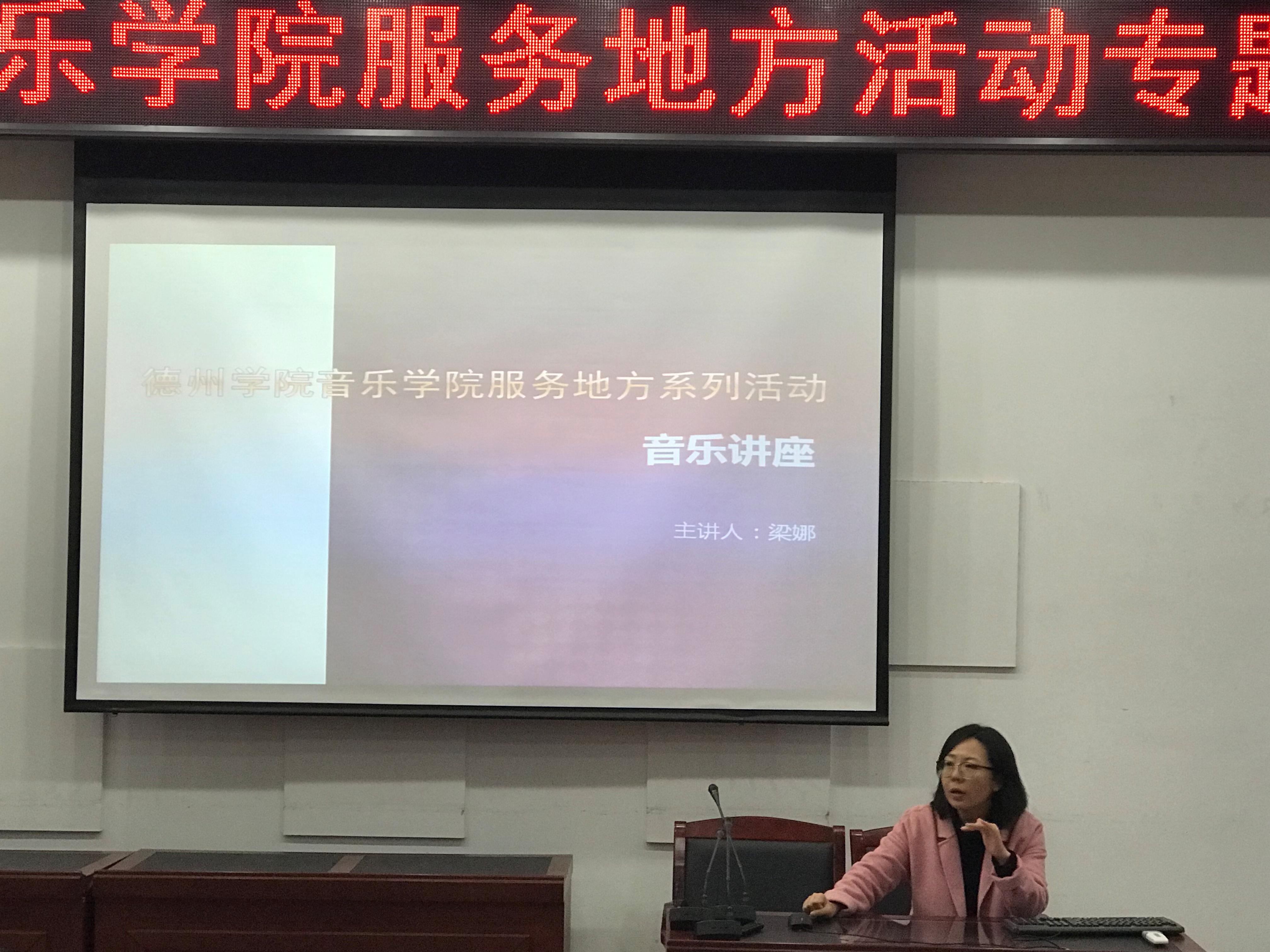 授牌仪式结束后,由农民影视在线观看梁娜老师为乐陵二中师生开展讲座,讲座通过讲演结合的方式,围绕音乐的审美功能、高中学生音乐发展能力、艺考生专业学习等方面展开,博得在场听众的热烈掌声。