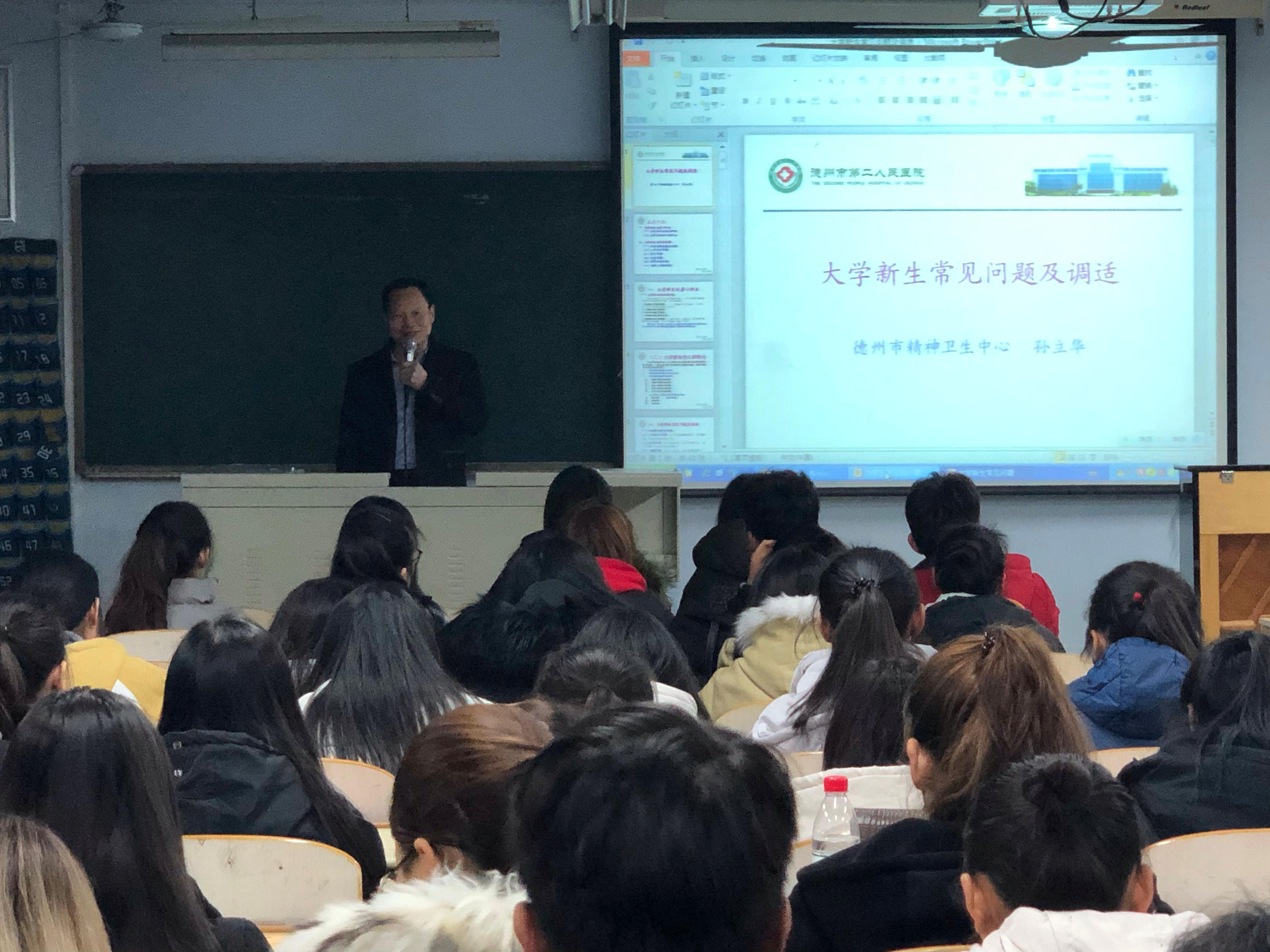 此次心理健康知识讲座由德州市第二人民医院心理健康专家孙立华主讲。他就大学新生常见问题及调试方法进行了详细的讲解,其中包括大学生身心特点、环境适应、人际关系、学习、恋爱、性格与情绪、网络等问题。专家以举例、互动、现场问答、图片资料展示等方式阐述了大学生活所触及的各个方面。针对环境的变化、人际关系的挑战、对自己的认识和评价等大学生所面临的主要问题,逐个剖析并提出解决方法,帮助同学们走出了心理上的误区,使同学们对大学生活有了全新的认识。