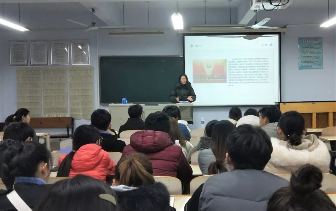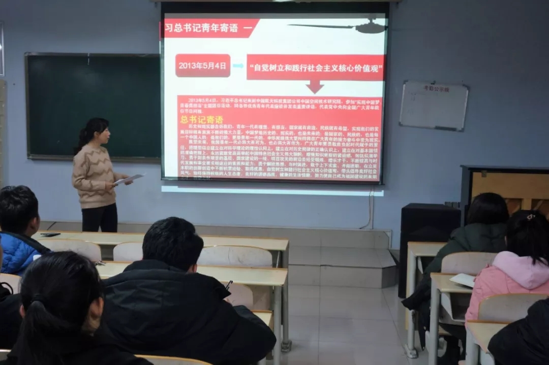 12月3日,开班第一讲由党总支副书记贺昱主讲,她通过对“习近平寄语青年”的论述引出社会主义核心价值观,分别从国家、社会、个人三个层面对二十四字社会主义核心价值观进行详细解读,并结合大学生实际着重地分析了如何将爱国、敬业、诚信、友善运用到生活中。