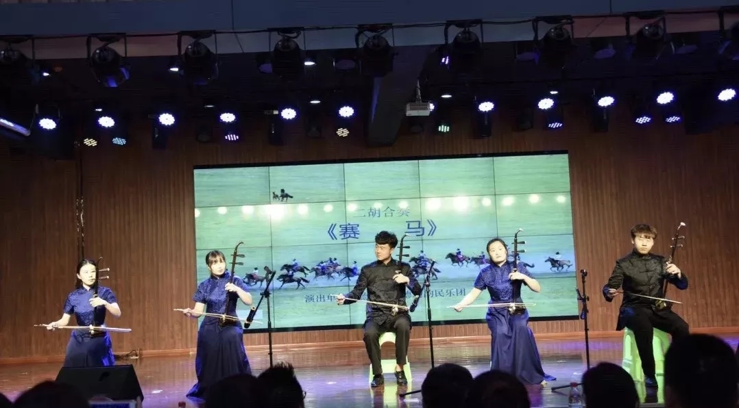 弦乐五重奏《闲聊波尔卡》、竹笛独奏《扬鞭催马运粮忙》、舞蹈《向天歌》等精彩节目,无不充分展现了同学们扎实的专业能力和舞台表演功底,迎来了现场师生热情的掌声。李琛老师演唱的歌曲《我们的新时代》,更是将演出推向了高潮。