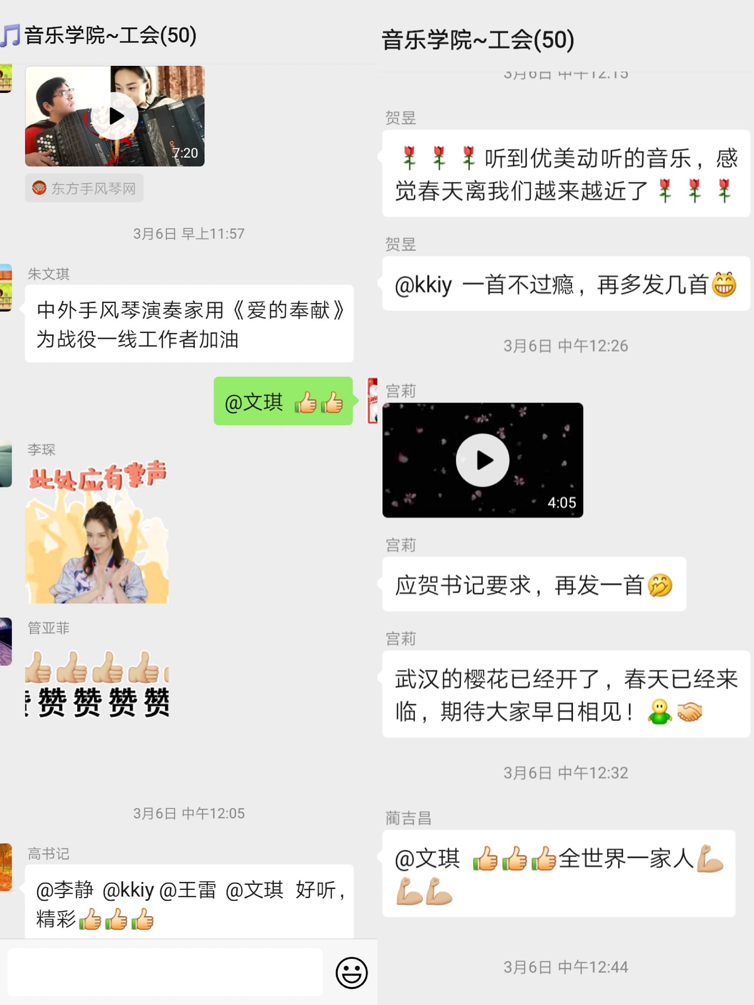 在工会群首先分享了由农民影视在线观看老师们在疫情期间用“声”援疫的主要作品有:李静老师演唱的《开满花香的名字》、李冰老师表演的河南坠子《致敬!逆行者》、由刘晶和马锡骞老师创作,李琛、刘洋、李兴虎演唱的《谢谢你》、刘晶和贺昱老师朗诵的《新时代最可爱的人》、徐琦老师古埙演奏《假如爱有天意》。还有李静、宫莉、朱文琪、樊海伦、王雷等诸多老师们在群里分享、交流了歌曲《保重》《满城樱花》《九零后姑娘》、手风琴《爱的奉献》、小提琴《四季.春》、家书等多种形式的作品。