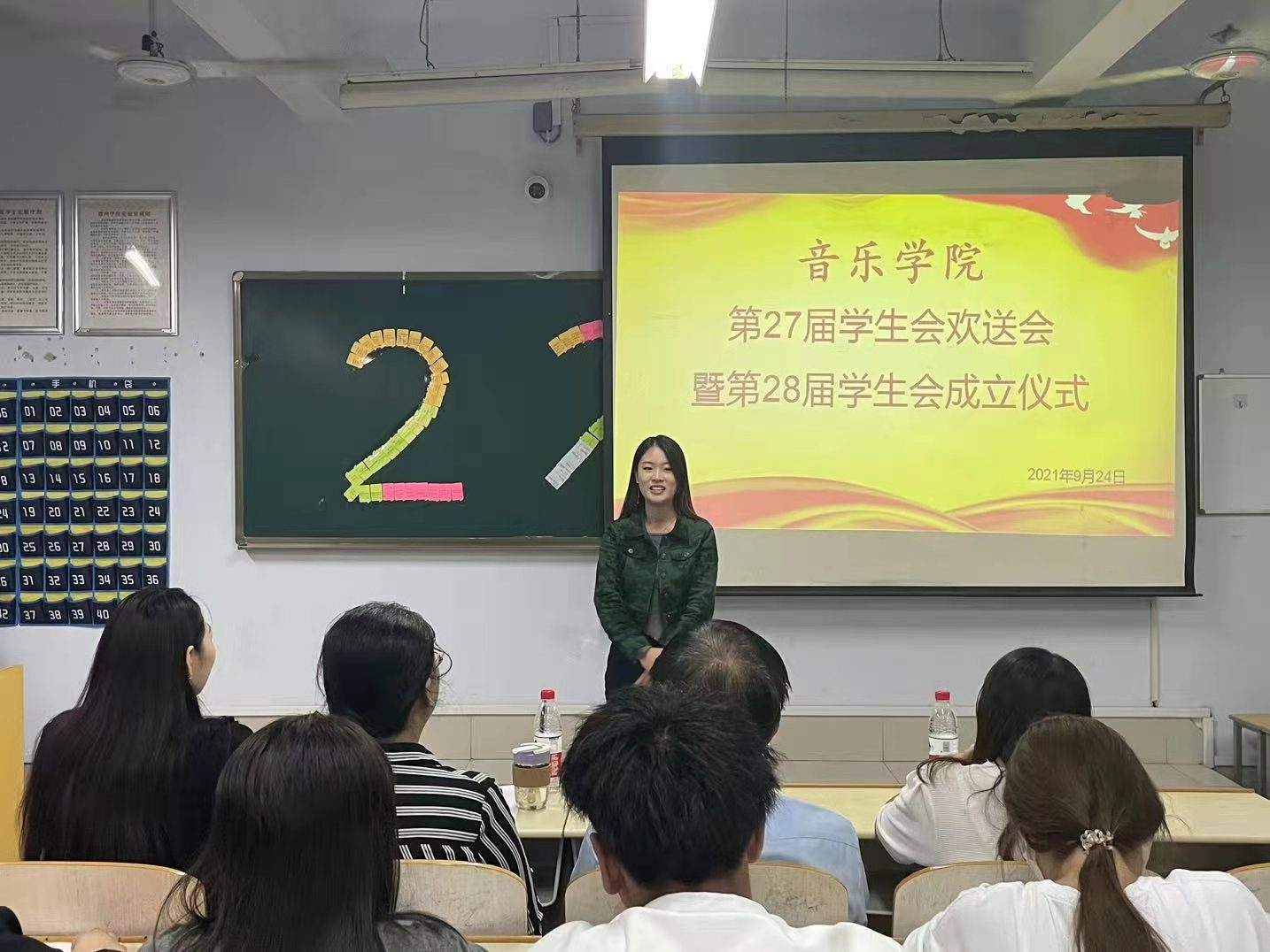 团总支书记陈璨讲到:“所有过往皆是勋章,所有未来都可期待,希望28届学生会站在27届学生会的肩膀上乘风破浪,勇往直前。”