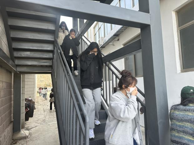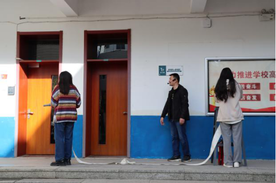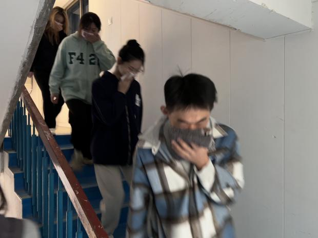 下午3点30分,消防演练正式开始。随着火警铃声响起,音乐楼迅速进入火情紧急状态,各楼层的安全负责人迅速到位指挥同学们疏散,引导学生保持冷静,向安全区域集合。全体同学用毛巾捂住口鼻,有序撤离。整个过程紧张而有序,师生们展现出了良好的应急处理能力和团结协作精神。