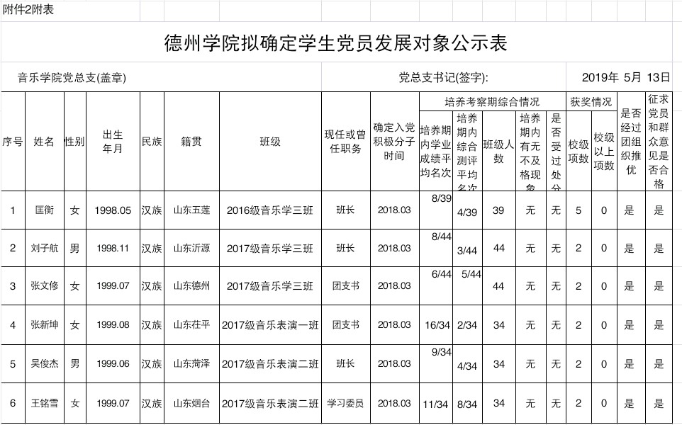 经党组织培养考察,征求党员、群众和培养联系人意见,支委会讨论研究、党总支审查,拟确定匡衡等6人为党员发展对象。为增强发展党员工作的透明度,接受党内外群众的监督,确保发展党员的质量,根据上级文件精神和《中共德州学院委员会发展党员工作实施细则》的要求,现将拟确定发展对象的基本情况公示如下(名单附后):