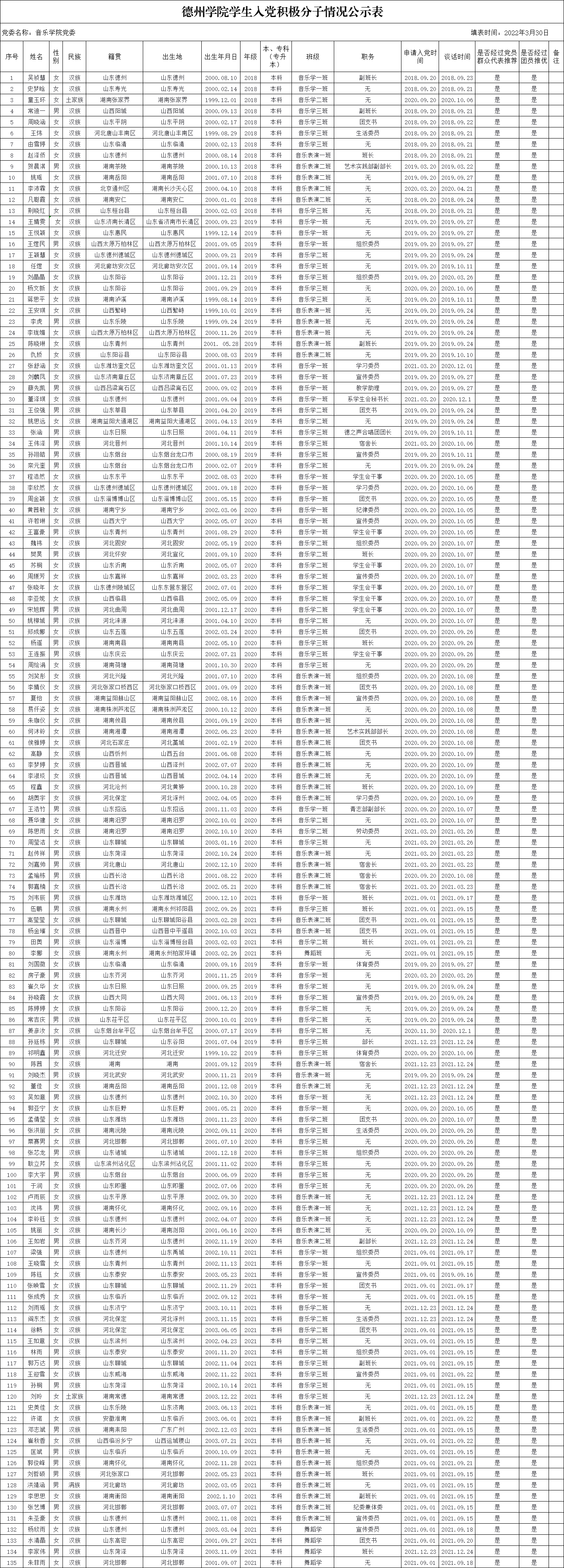 经党组织培养考察,通过党员、群众代表无记名投票推荐和团员推优,支委会讨论研究、党委审查,确定吴祯慧等139人为入党积极分子。为增强发展党员工作的透明度,接受党内外群众的监督,确保党员后备队伍的质量,根据上级文件精神和《中共德州学院委员会发展党员工作实施细则》的要求,现将新确定入党积极分子的基本情况公示如下(详见附表):