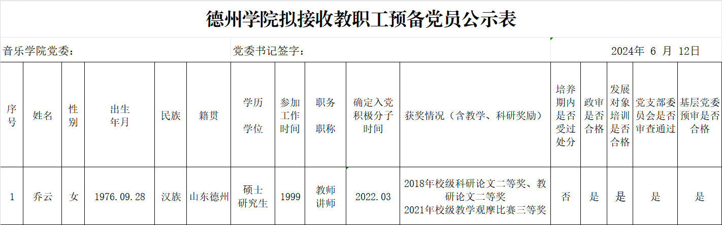 经党组织培养考察,征求党员、群众和培养联系人意见,支委会讨论研究、政治审查、集中培训、基层党委预审,拟接收乔云等20名同志为中共预备党员。为增强发展党员工作的透明度,接受党内外群众的监督,确保发展党员的质量,根据上级文件精神和《中共德州学院委员会发展党员工作实施细则》的要求,现将拟接收预备党员的基本情况公示如下(名单附后):