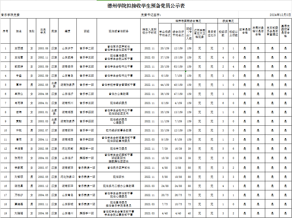 经党组织培养考察,征求党员、群众和培养联系人意见,支委会讨论研究、政治审查、集中培训、基层党委预审,拟接收王丽媛等19名同志为中共预备党员。为增强发展党员工作的透明度,接受党内外群众的监督,确保发展党员的质量,根据上级文件精神和《中共德州学院委员会发展党员工作实施细则》的要求,现将拟接收预备党员的基本情况公示如下(名单附后):