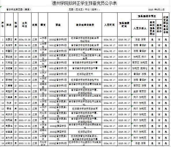 经党组织培养考察,征求党员、群众和入党介绍人意见,拟于近期讨论王嘉玄等20名同志转为中共正式党员。为增强发展党员工作的透明度,接受党内外群众的监督,确保发展党员的质量,根据上级文件精神和《中共德州学院委员会发展党员工作实施细则》的要求,现将拟讨论转正的中共预备党员基本情况公示如下(名单附后):