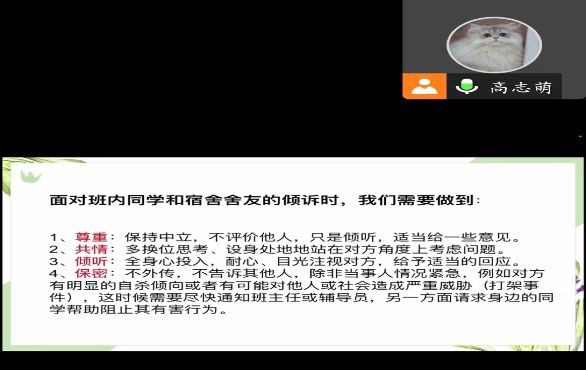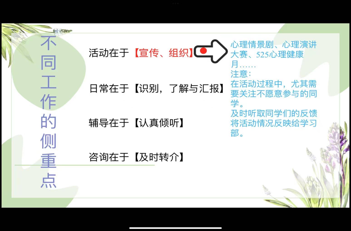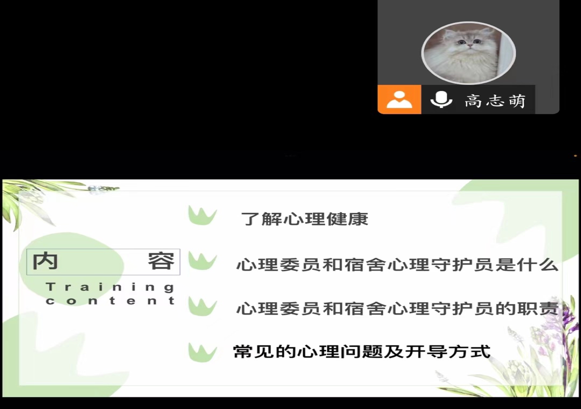 会议中,主持人向大家讲解心理健康对于大学生的重要性,阐明心理委员和宿舍心理守护员在高校心理健康工作中的重要性,并鼓励心理委员,宿舍心理守护员在接下来的培训中积极参加,共同守护好农民影视在线观看学生群体心理健康工作。
