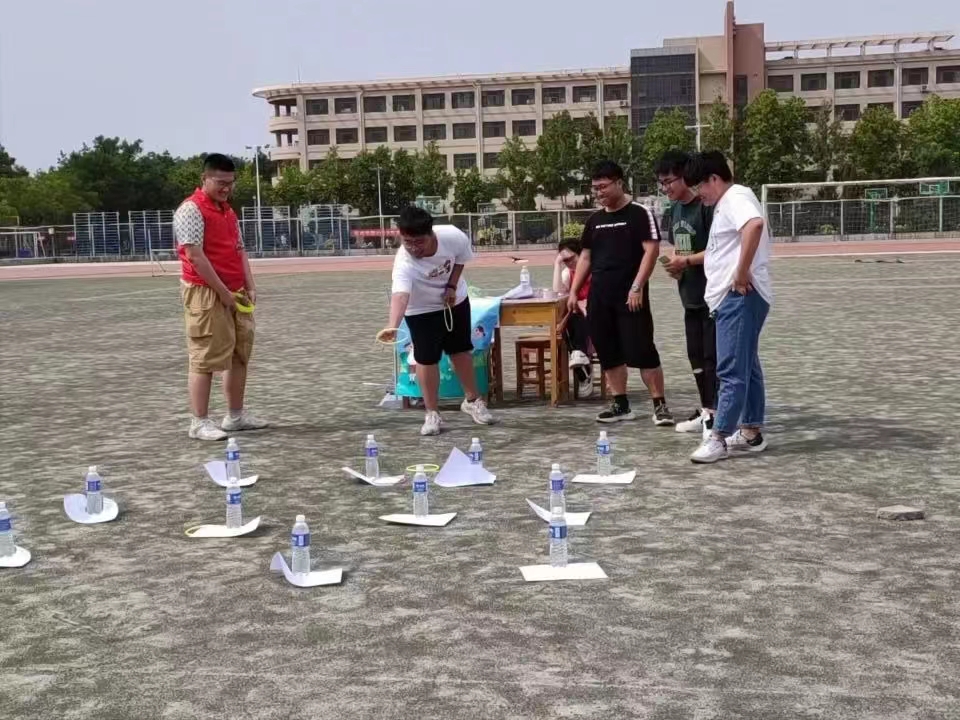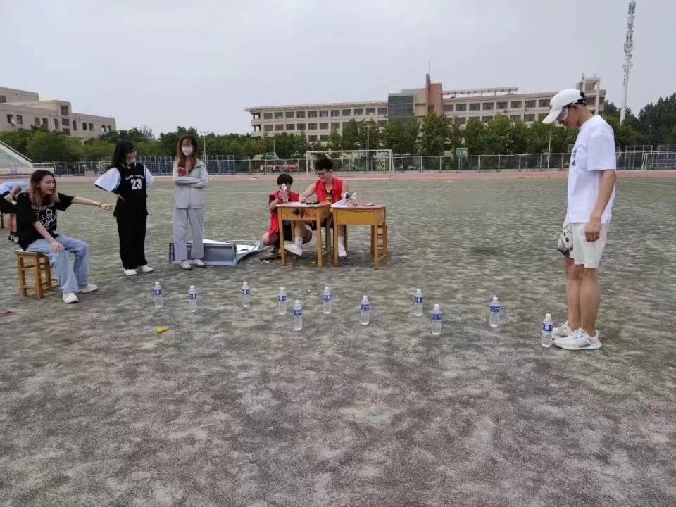 “伴你同行”游戏中设有水瓶障碍物一人蒙住双眼另一人通过语言对同伴进行引导,踢到水瓶不超过四个方可获胜此游戏通过互动的形式促进了彼此交流增加了同学们的合作意识。