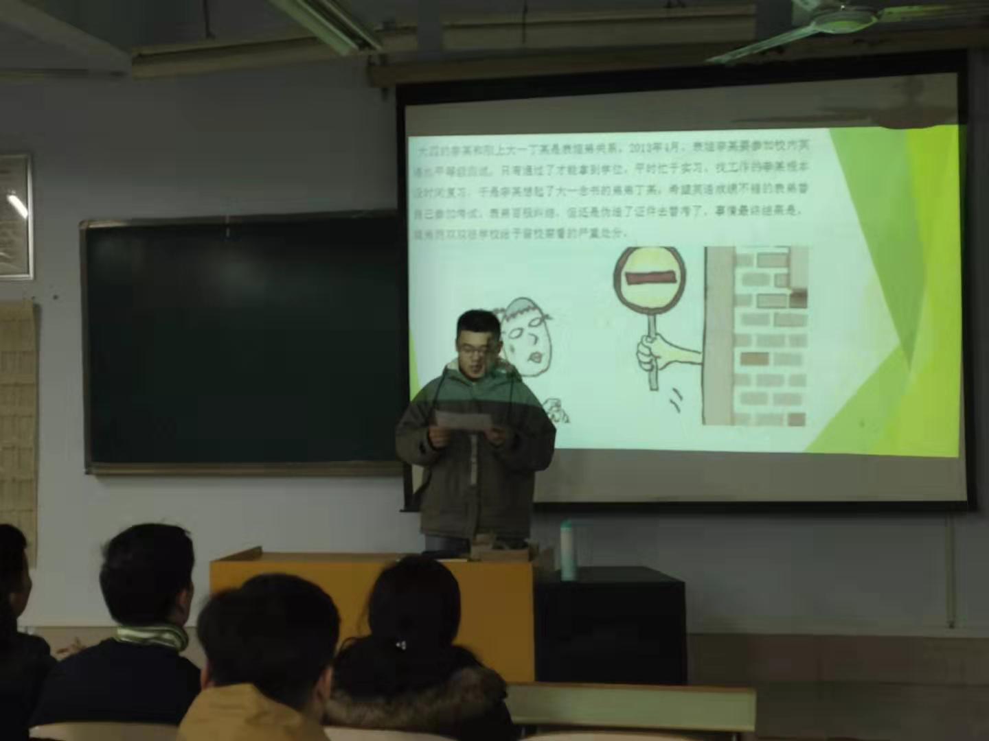 活动开始,由各班学生代表上台宣读关于各高校考试作弊的真实案例,让同学们深刻认识到考试作弊的严重性和不可逆性。随后,辅导员禹亚辉老师向同学们讲述一些考试中会遇到的问题,并讲解了学校对考试作弊行为的认定和处理方法,告诉同学们要树立诚信意识,认清考试舞弊行为的危害性和不可弥补的后果。之后,主持人带领全体学生学习《德州学院学风新十条》,并进行了“诚信应考,拒绝舞弊”的宣誓,各班代表上台签下保证书。最后,由党总支副书记贺昱老师为本次活动进行总结发言,鼓励同学们摆正心态,打好基础,讲原则,树诚信,坚守大学学习生涯的“生命线”,也为我们讲述了身边近几年的真实作弊案例和严肃的处理结果,她提醒同学们要有“端正心态不犯错误”的意识;警示同学们“没被抓到不是幸运,逃脱了学校的惩罚,社会将会给你更大的惩罚”,要求大家“正确衡量自己付出的努力,不期待获得超出努力之外的成绩”。