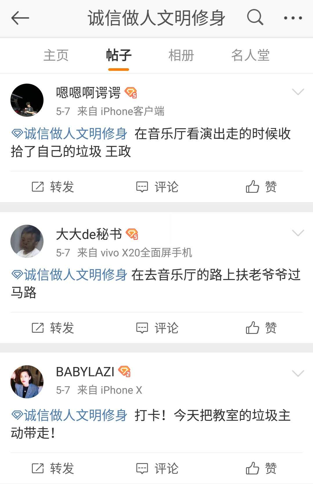 根据本次活动的要求,学院列出15种不文明行为,学生结合自身情况选出五种可以通过自身努力与坚持改变的不文明行为,通过发朋友圈、发微博的方式对每日文明修身任务完成情况进行打卡,切实做到从我做起,从小事做起,以此强化学院精神文明建设,增强学生文明意识,树立我院学生的良好风范和形象。