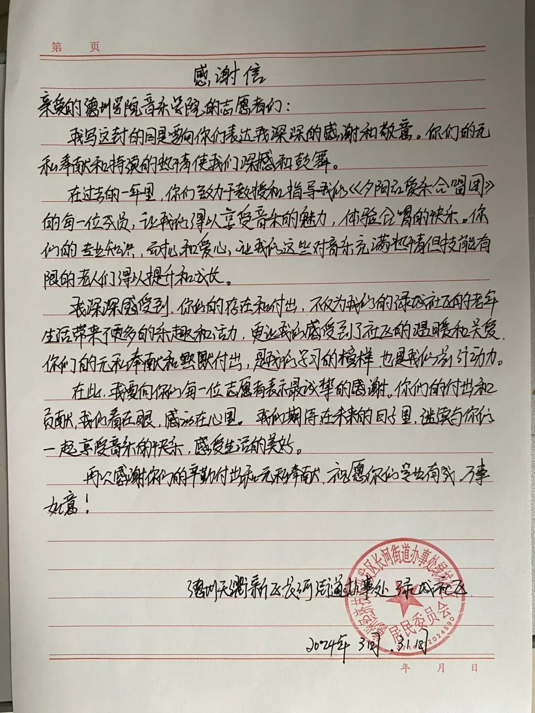 信中,既表达了对志愿者们辛勤付出的感激之情,同时也传达了社区群众对学院青年志愿者专业水平的认可。自2023年起,农民影视在线观看志愿者每周都会到绿城社区,为社区老人组成的“夕阳红”爱乐合唱团进行指导排练。累计上岗110余人,在志愿者的专业指导下,“夕阳红”爱乐合唱团表演水平得到了逐步提高,也吸引了越来越多的老年人参与进来。丰富了居民们的日常生活,收获了良好的效果。