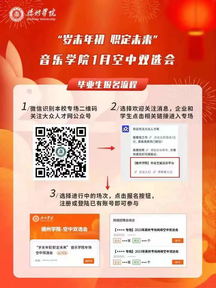 手机微信扫码关注“大众人才网”微信公众号,企业和毕业生分别点击相关按钮进入德州学院校招端口,点击本学院报名按钮,注册或登录已有账号即可直接参与。