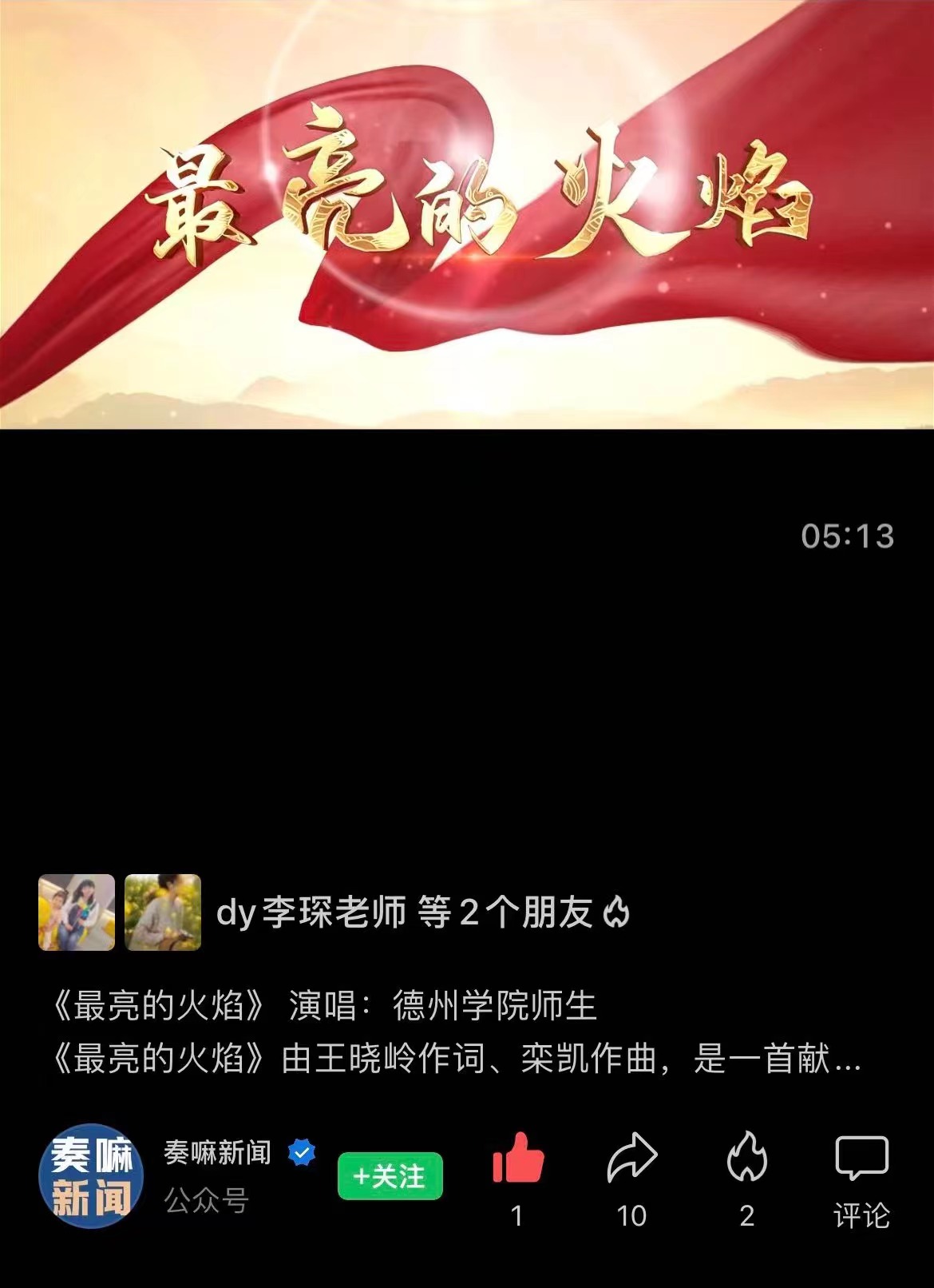 “七一”建党节到来之际,德州学院农民影视在线观看师生共同演唱歌曲《最亮的火焰》,向甘于奉献的共产党员致敬,向新时代奋斗者致敬。